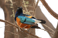 We started our journey on Saturday afternoon, flying from various parts of the U.S. to London. We continued on Monday morning with a flight to Nairobi, and then on Tuesday with a bus ride to Arusha. Finally it was Wednesday, day five of the trip, but day one of the safari, and we were itching to get started. It didn't take long. We drove out of town, away from the moist, runny slopes of Mt. Meru which encompass Arusha, and into the dryer lands south and west. After a quick stop at the grocery store for supplies (water, gin, rum, chocolate), and a two hour drive, we got to the entry station for Tarangire National Park. We got out of the cars to stretch our legs, and to pay the park entry fee. There were some really colorful birds in the parking lot, including the multi-hued starling which is sort of the local version of a pigeon: plentiful in number and typically found creeping up on you at the picnic table while you are eating lunch. Speaking of which, while we were itching to get started, our guides told us it was time for lunch, so we had to eat that before we could start looking for animals, and we thought, "how much longer is it going to be before we finally see something?" Well, not long at all. We finished our lunch and went back to the landcruisers to discover that we were going topless (for one. Loosely topped for the other vehicle). We hopped in, drove through the park gate and one minute later came across a herd of zebra & wildebeest, and ten seconds further down the road passes a monkey, and we realized, Wow, this is going to be an amazing trip.